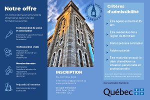 Ces formations de 26 semaines, rémunérées par Service-Québec, s’adressent aux personnes âgées de 18 à 35 ans vivant des difficultés d’insertion socioprofessionnelle et résidant sur l’Île de Montréal.